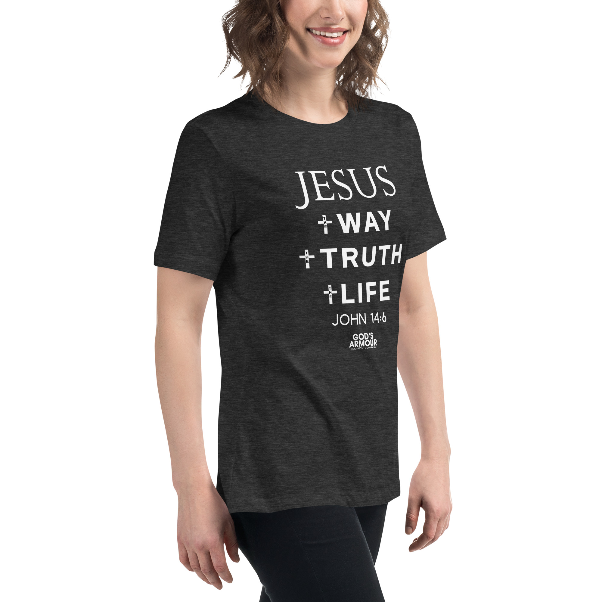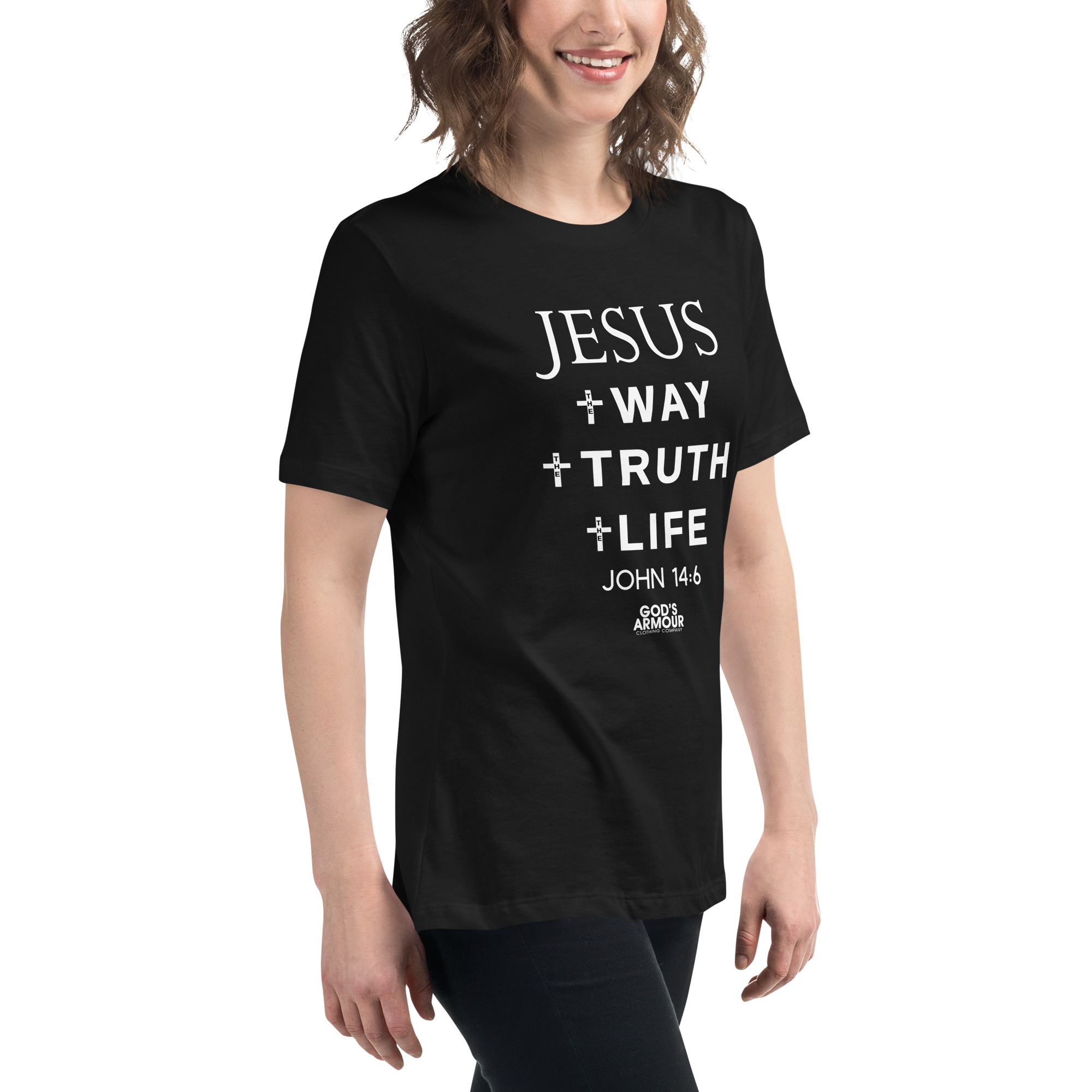 Protect yourself and loved ones with the Sword of the Spirit! God’s Armour has created a special line of clothing embedded with a Transformative Spiritual Knowledge. Our Women’s Christian John 14:6 T-Shirt will protect you from the enemy with the living word of God! (Ephesians 6)